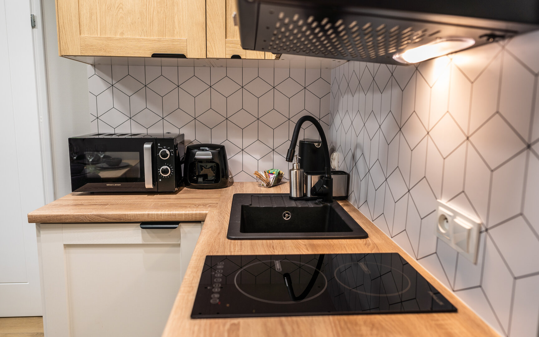 - w pełni wyposażony aneks kuchenny ( lodówka, płyta grzewcza , czajnik, mikrofalówka, ekspres do kawy, naczynia),