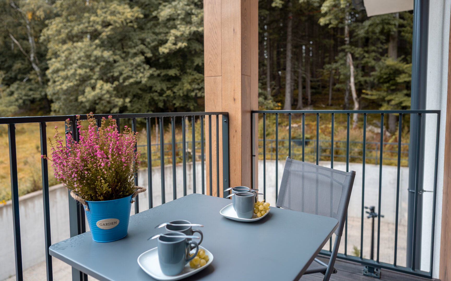Komfortowy apartament z prywatnym jacuzzi na tarasie z widokiem na góry.