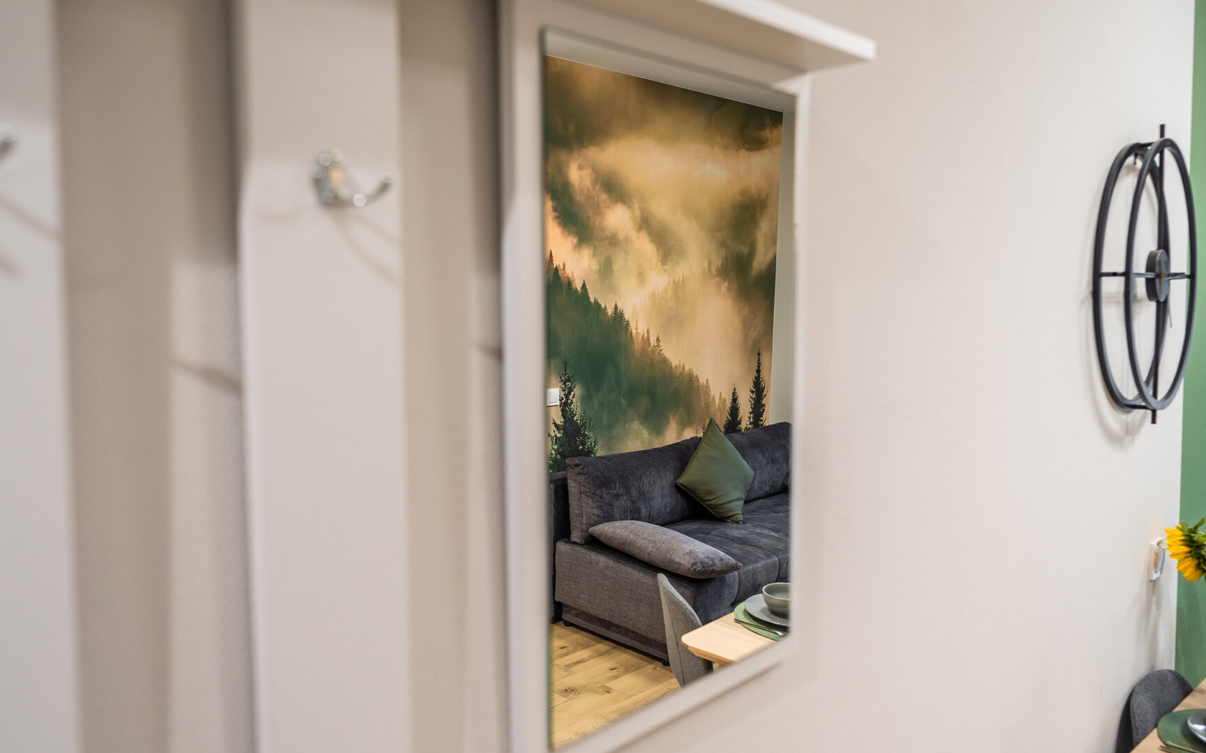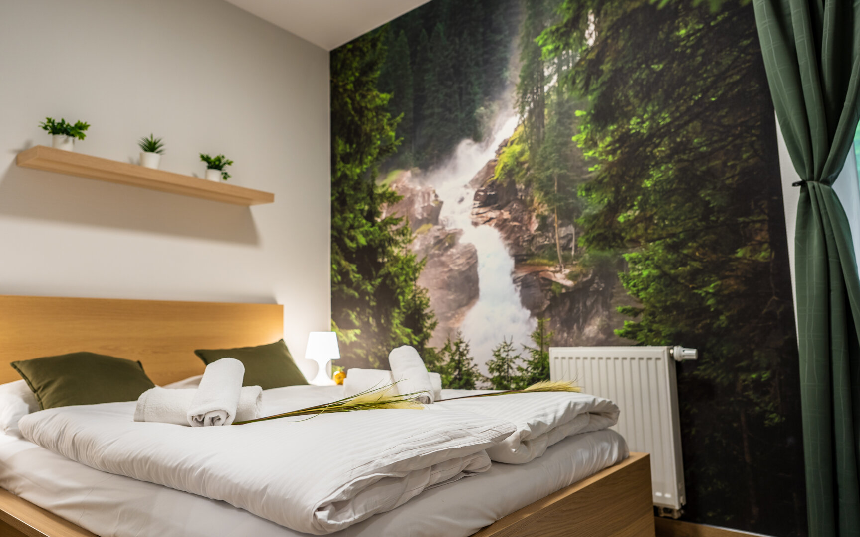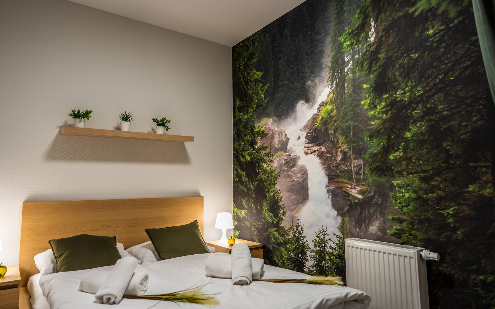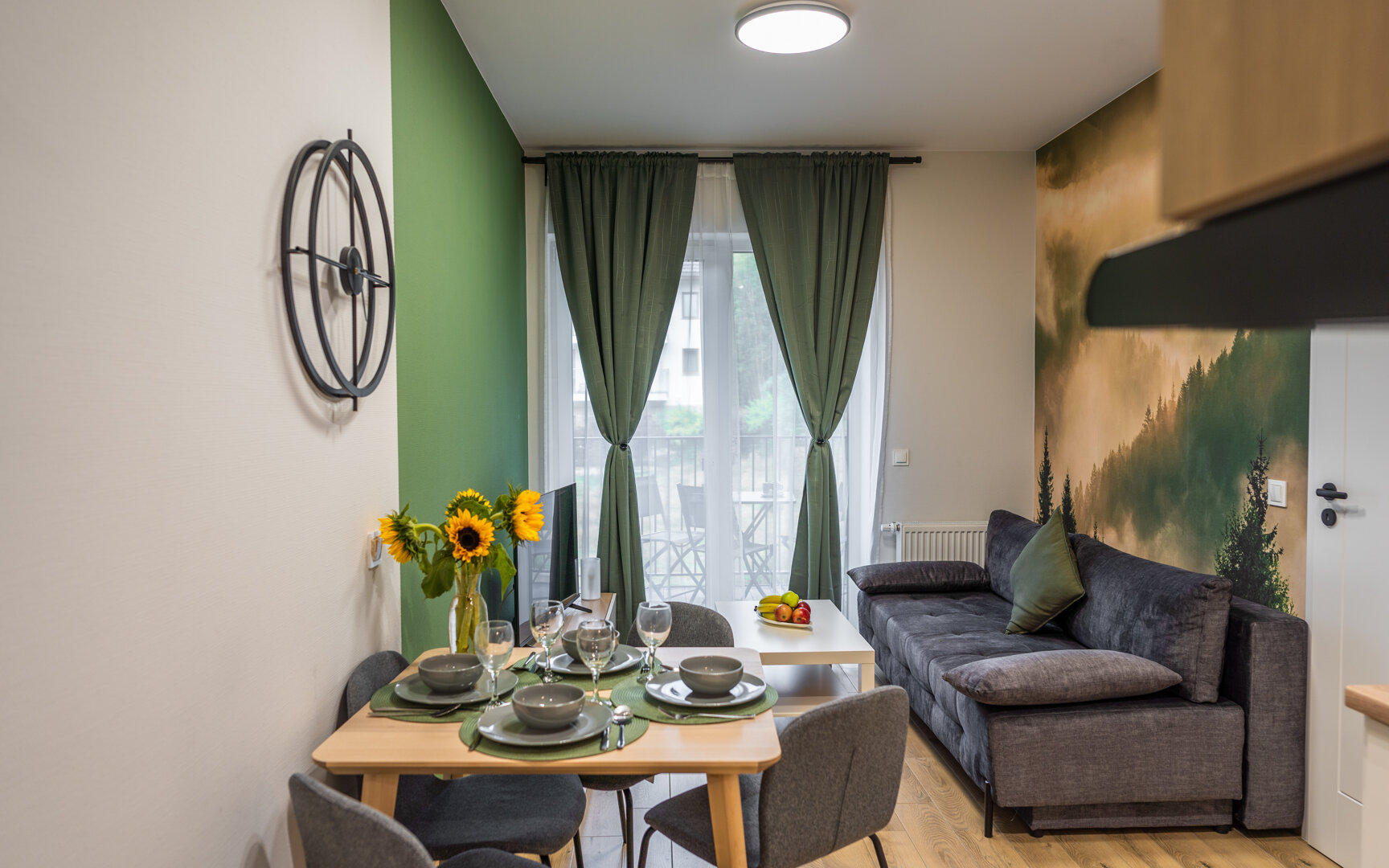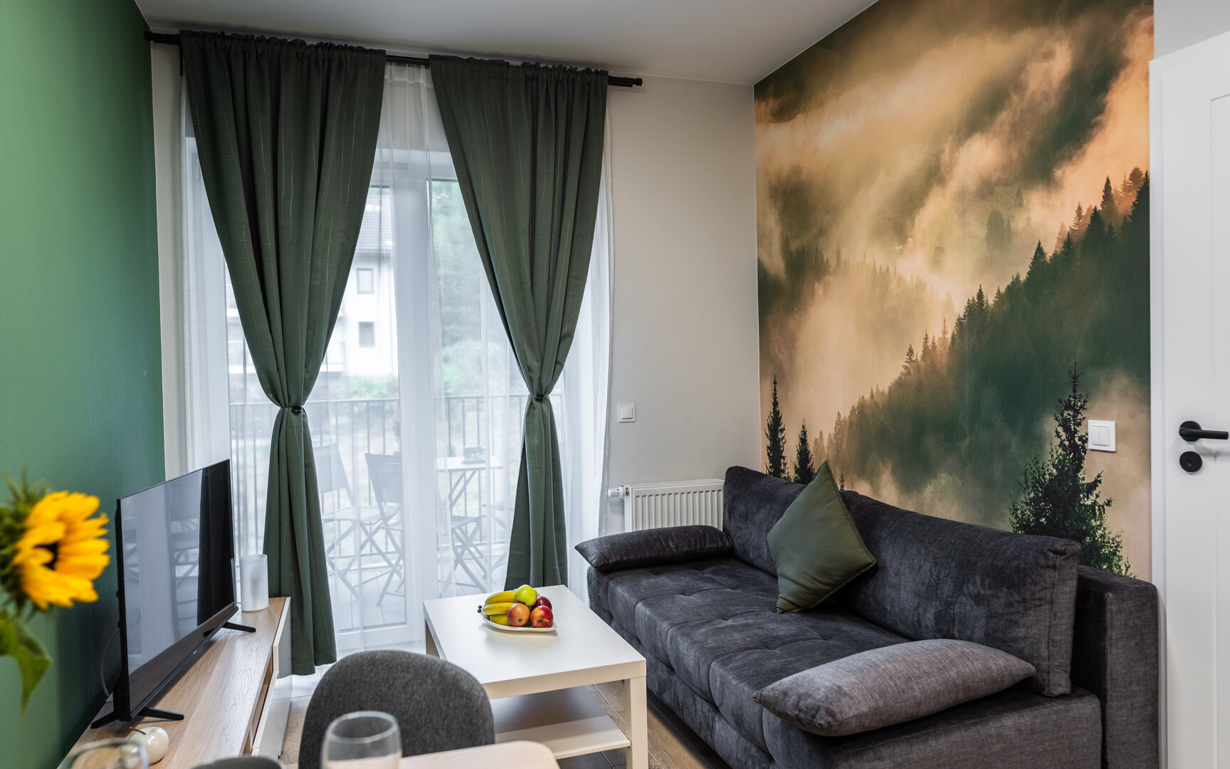 Apartament Ostoja Parku Narodowego to miejsce , w którym nowoczesny design spotyka się z bliskością natury. Jasne wnętrze , zielone akcenty i tapeta z motywem lasu tworzą wyjątkowy klimat sprzyjający relaksowi.