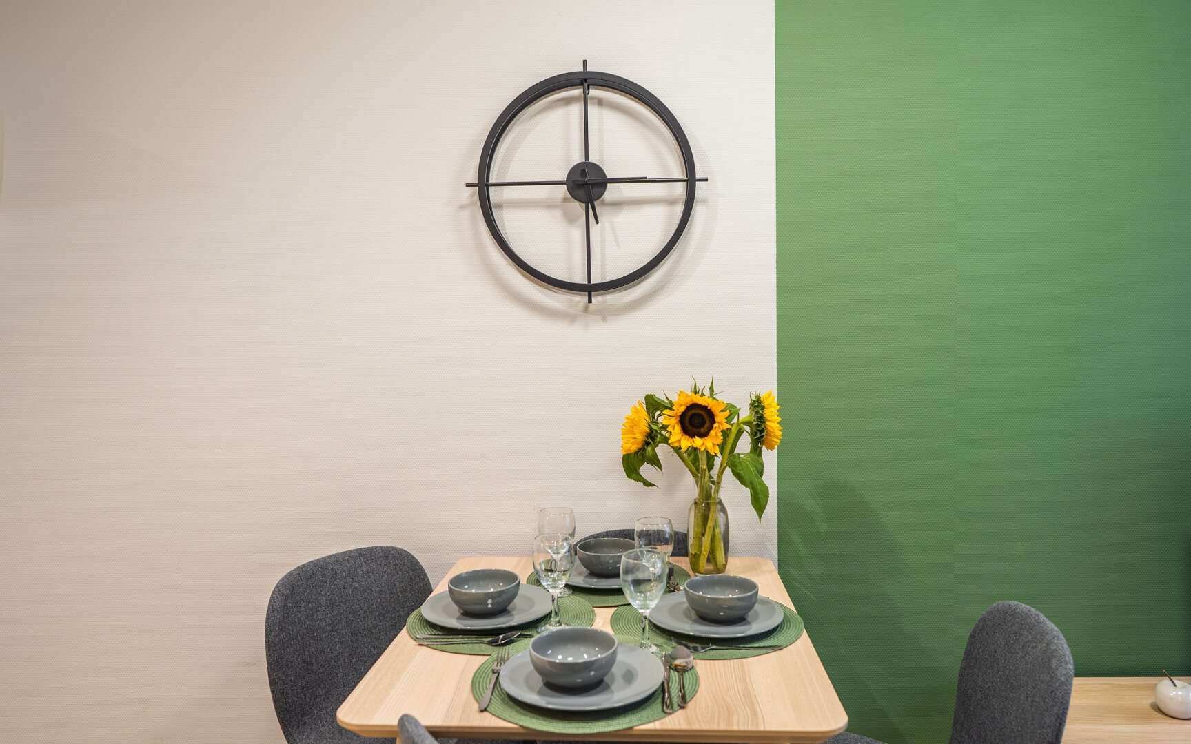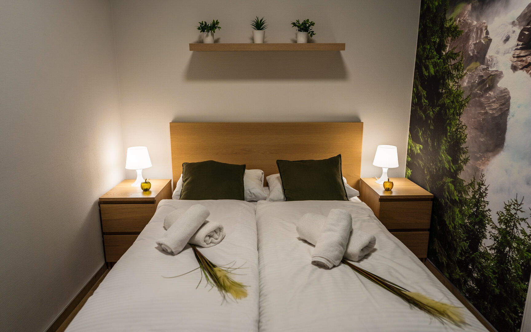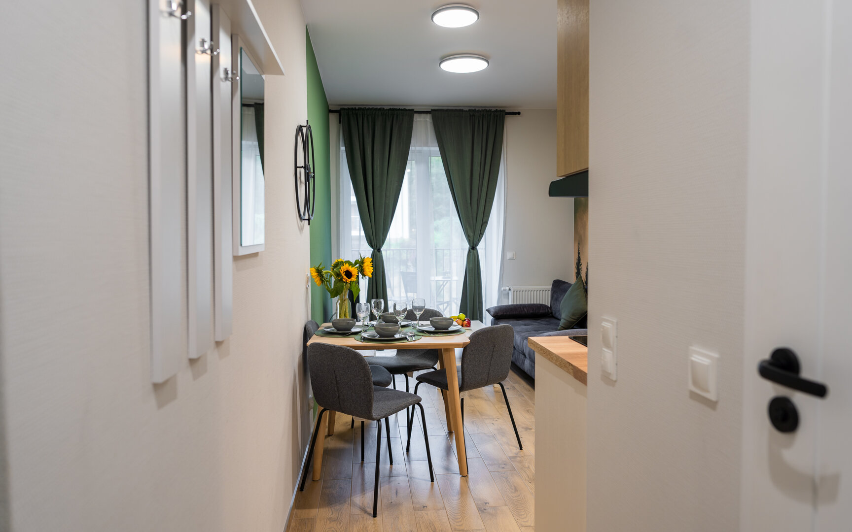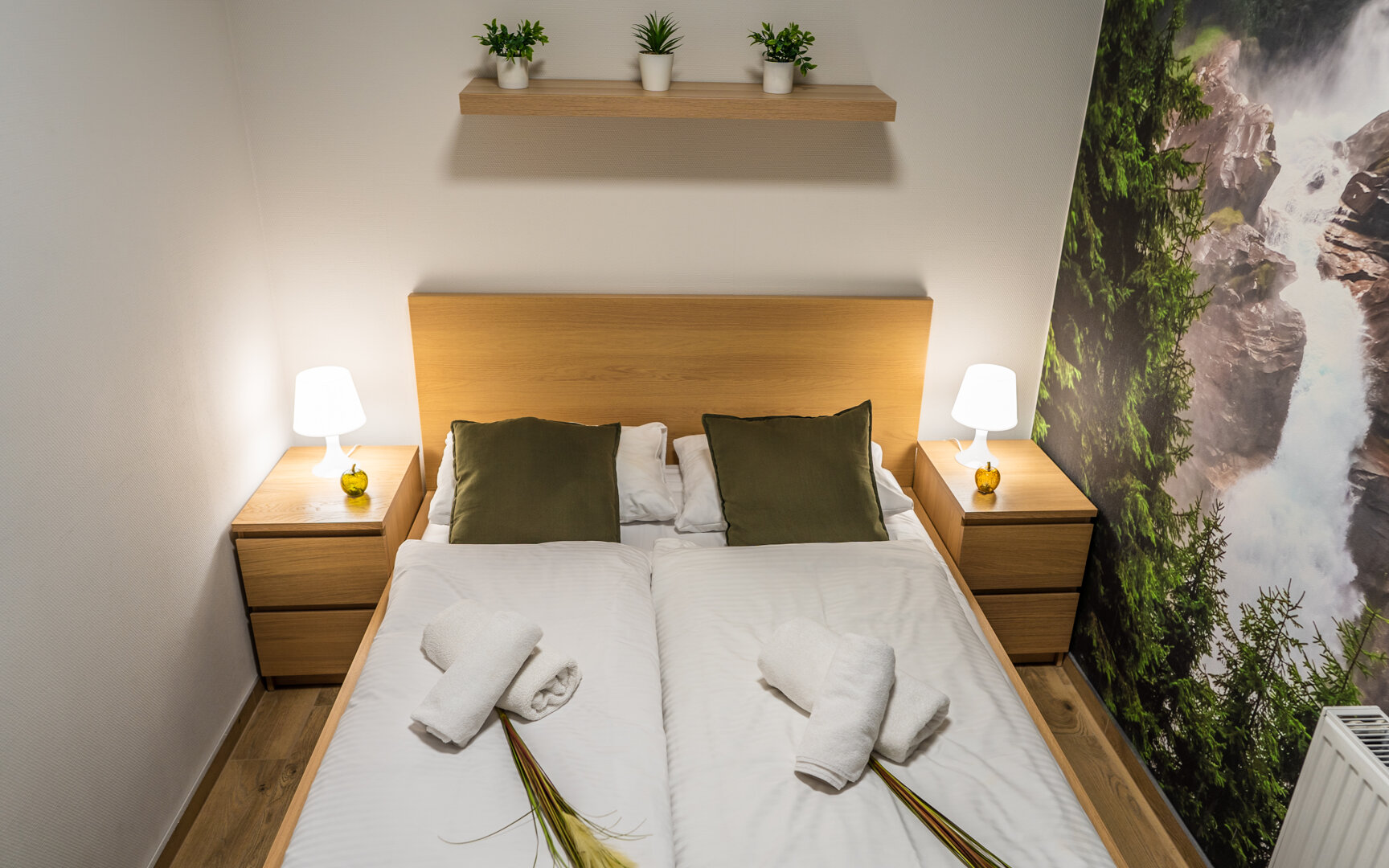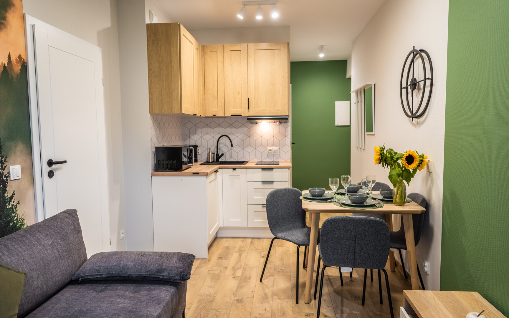 Apartament Ostoja Parku Narodowego to miejsce , w którym nowoczesny design spotyka się z bliskością natury. Jasne wnętrze , zielone akcenty i tapeta z motywem lasu tworzą wyjątkowy klimat sprzyjający relaksowi.