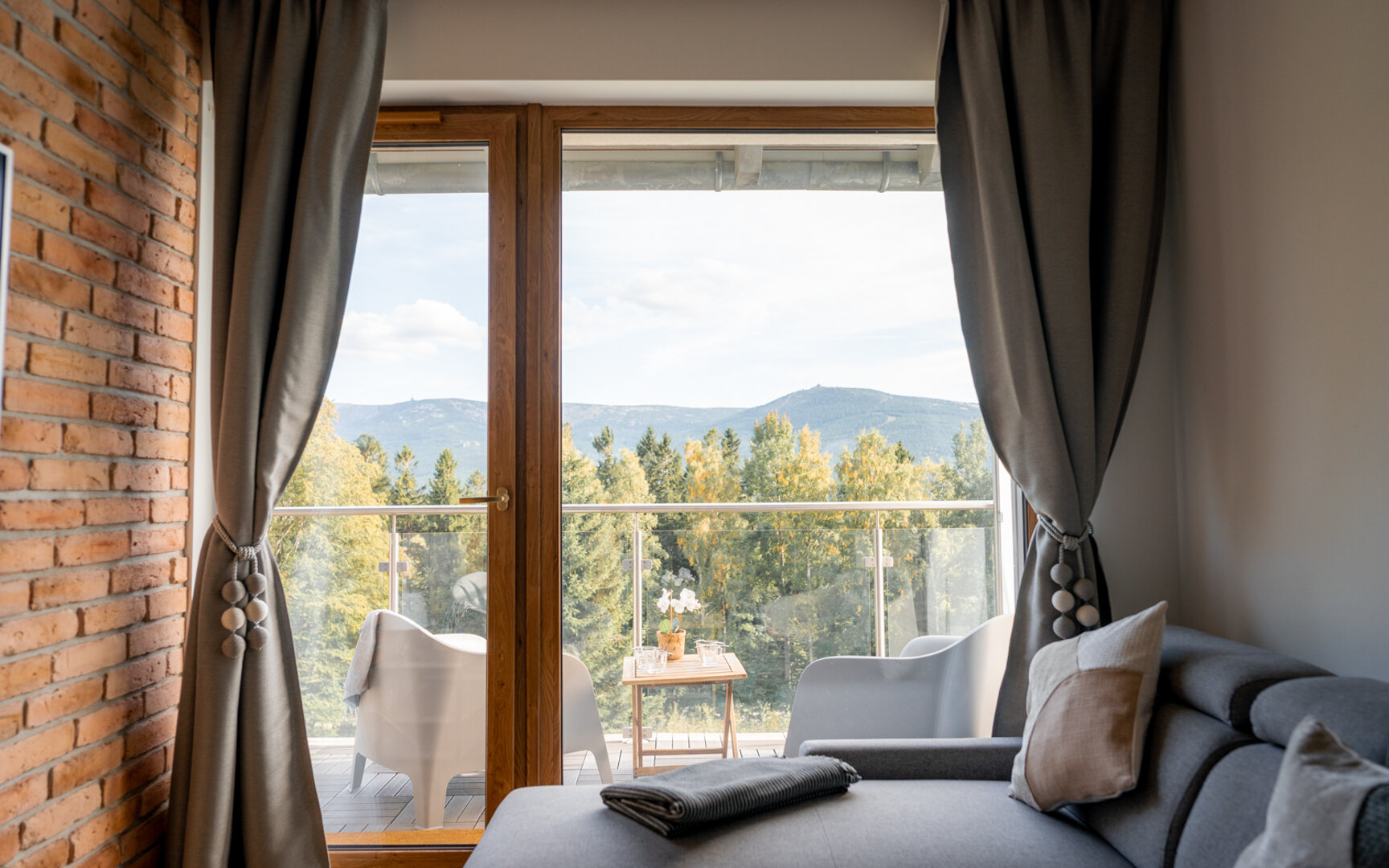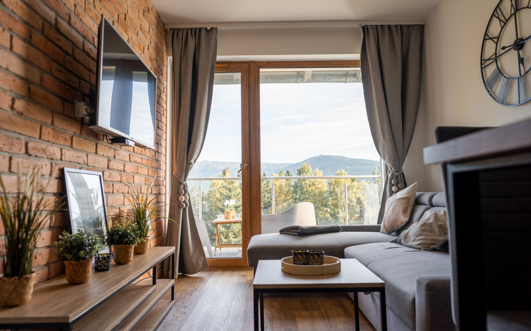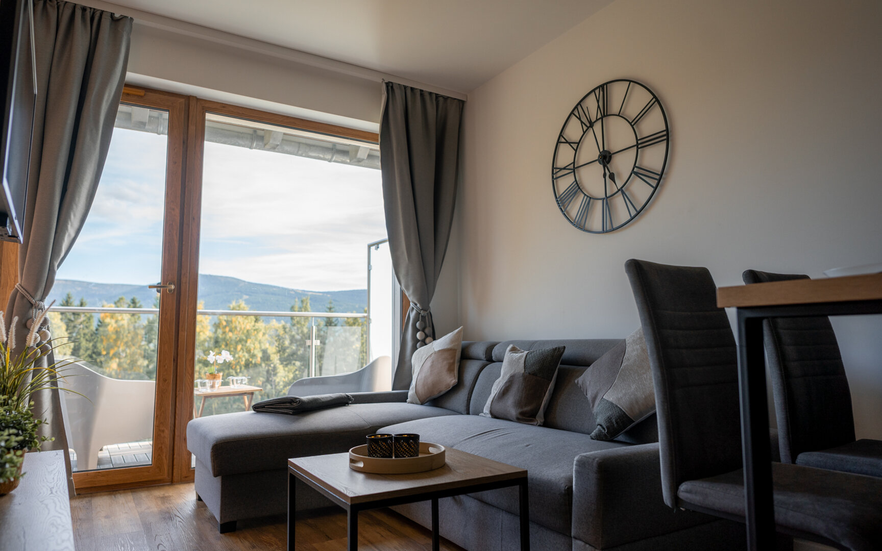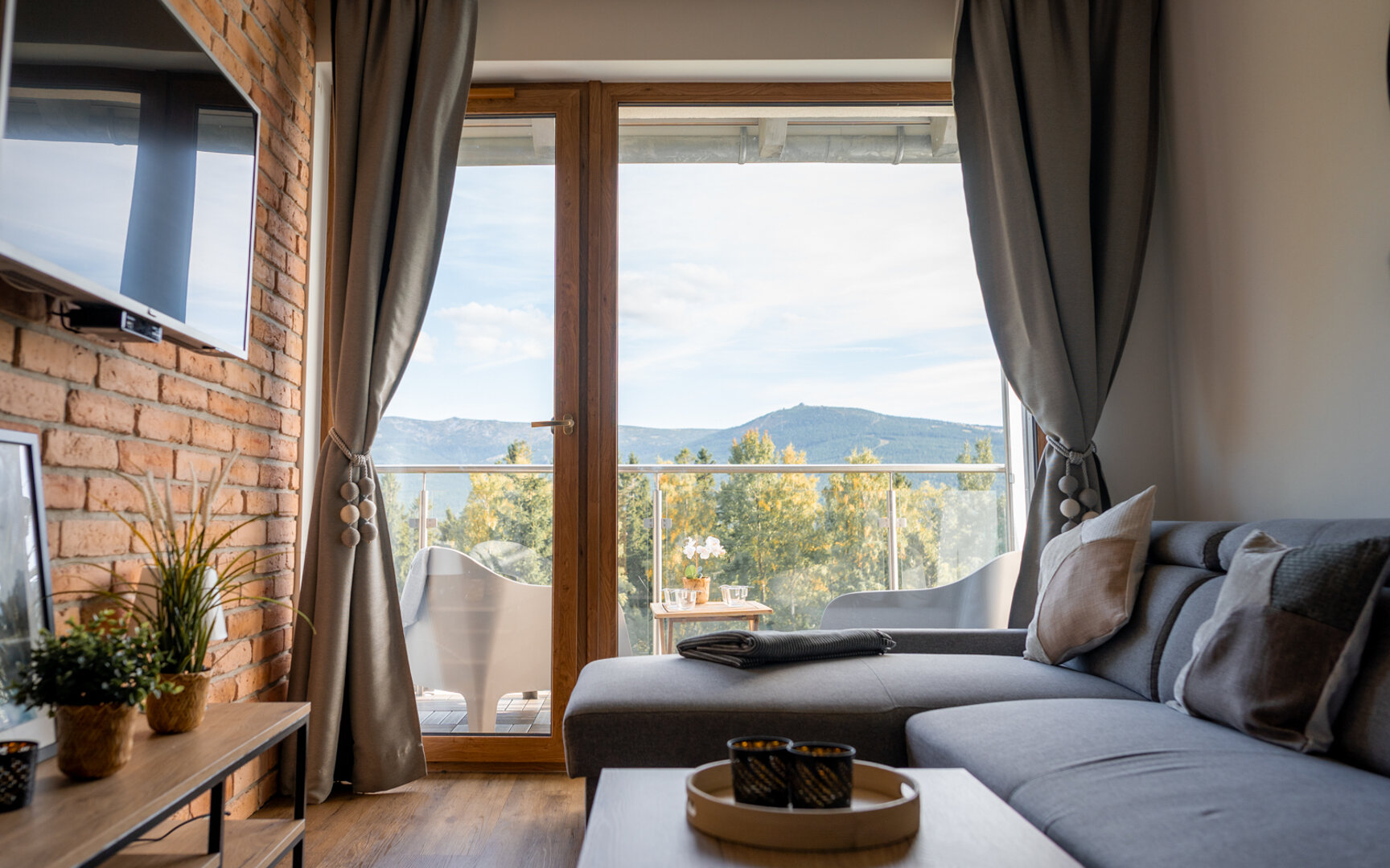 Z okien apartamentu rozpościera się niezapomniany widok na Szrenicę i panoramę Karkonoszy - poranki przy kawie w takim otoczeniu smakują lepiej niż gdziekolwiek indziej.