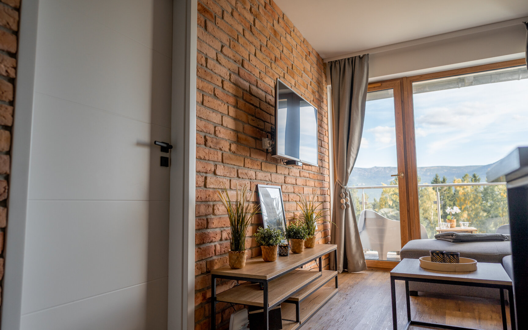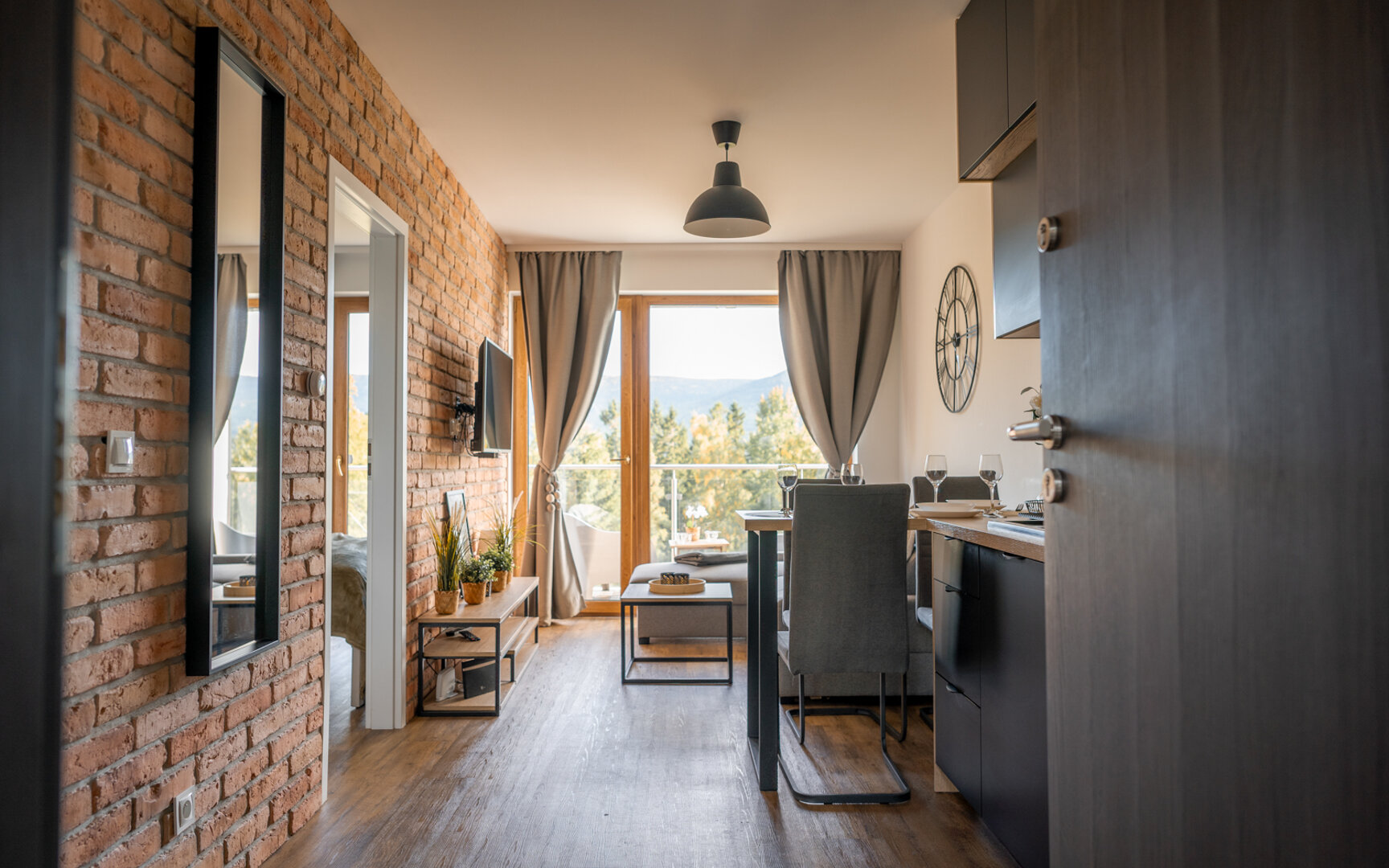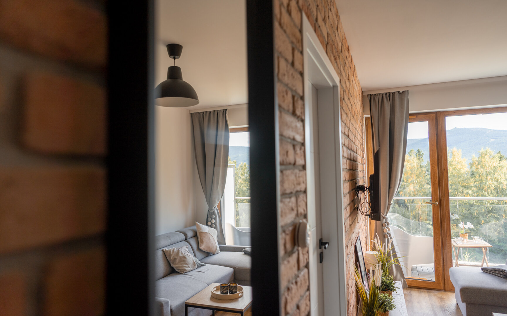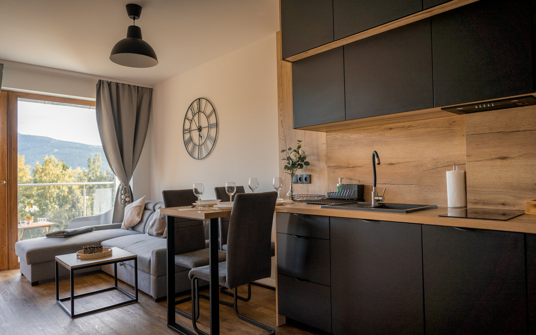 Z okien apartamentu rozpościera się niezapomniany widok na Szrenicę i panoramę Karkonoszy - poranki przy kawie w takim otoczeniu smakują lepiej niż gdziekolwiek indziej.