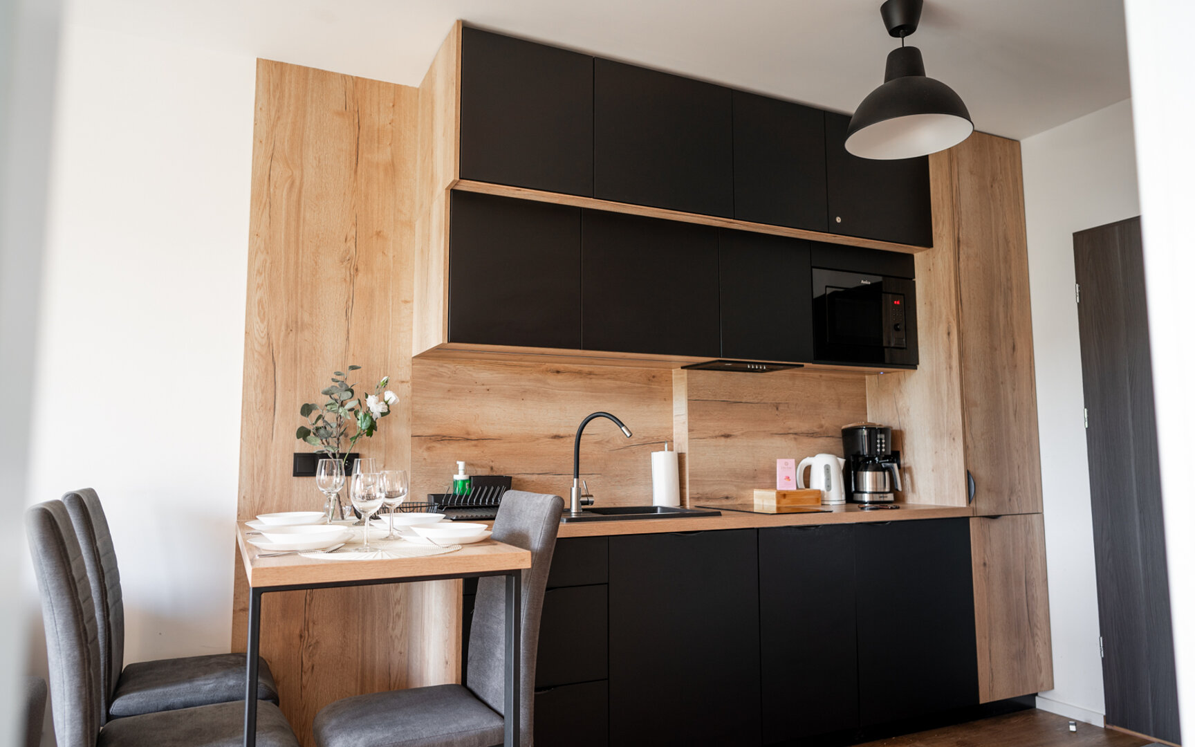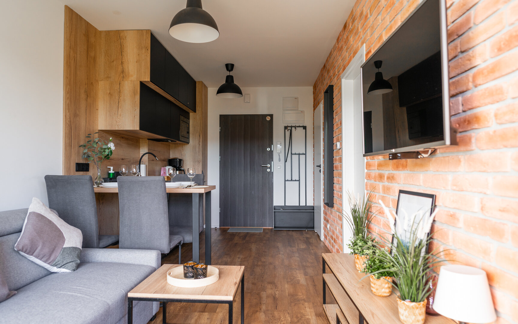 Apartament typu studio dla 4 osób. Jednopokojowy apartament z łóżkiem małżeńskim oraz rozkładanym narożnikiem. Na wyposażeniu aneks kuchenny oraz prywatna łazienka. Idealny dla pary lub rodziny.