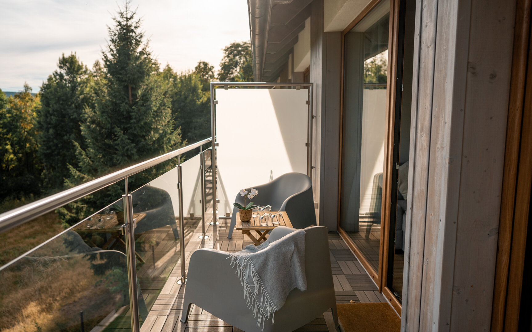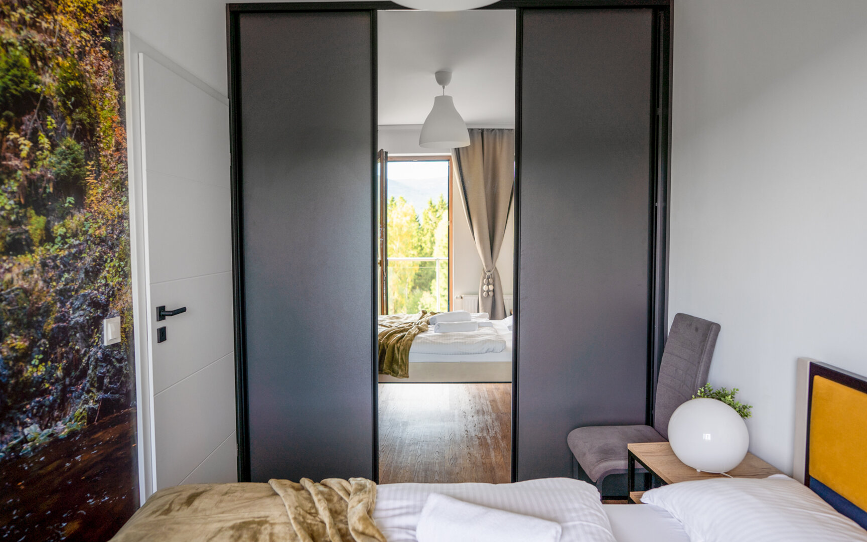 Przytulny apartament z balkonem, inspirowany naturą. Do dyspozycji gości bezpłatna sauna i pokój zabaw dla dzieci.
