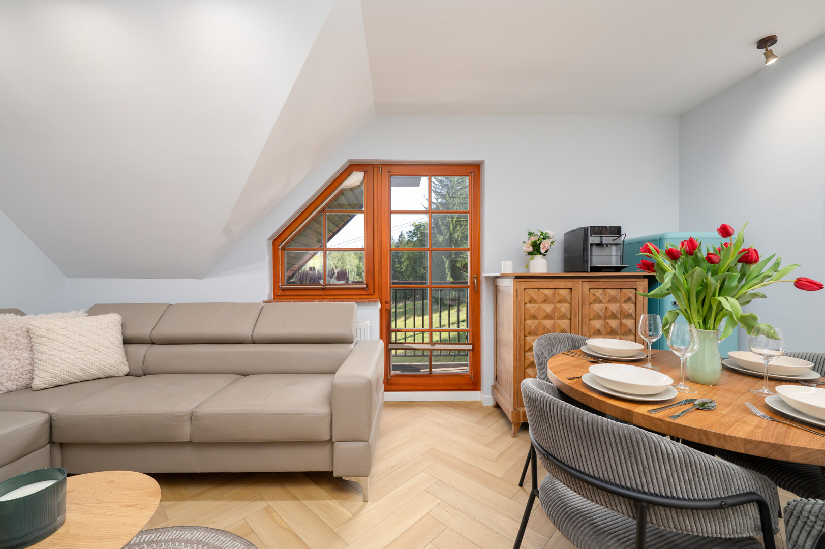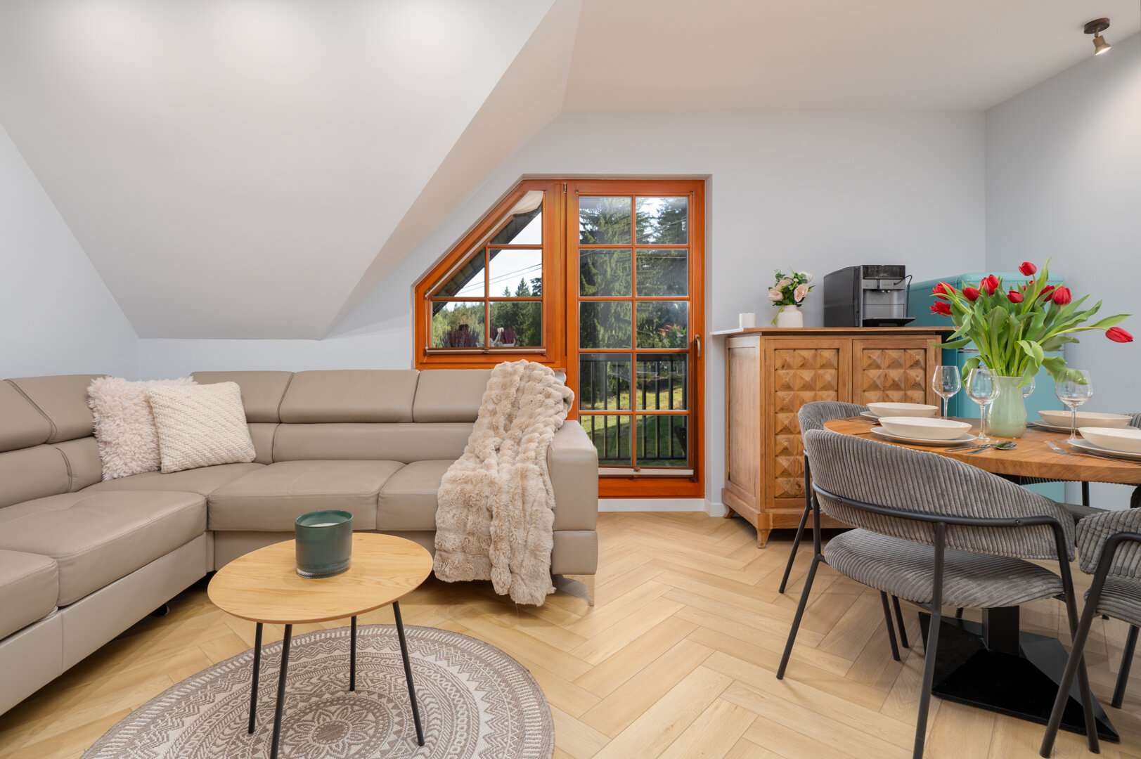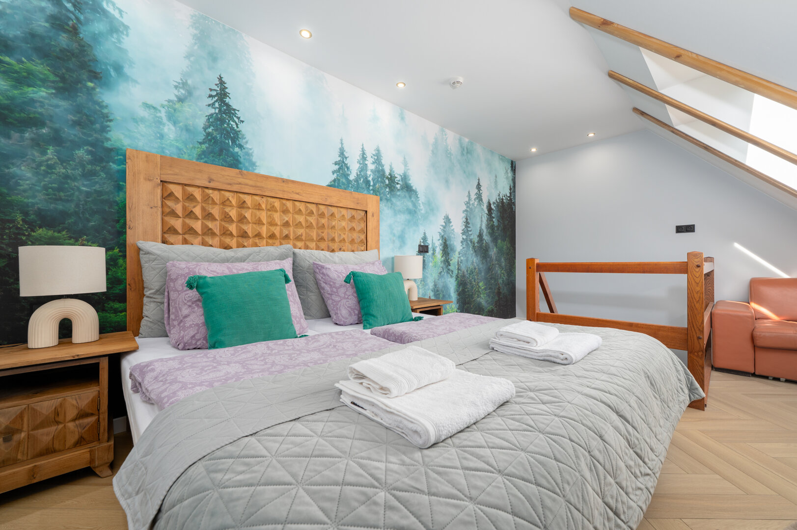 Przytulny apartament z balkonem, inspirowany naturą. Do dyspozycji gości bezpłatna sauna i pokój zabaw dla dzieci.