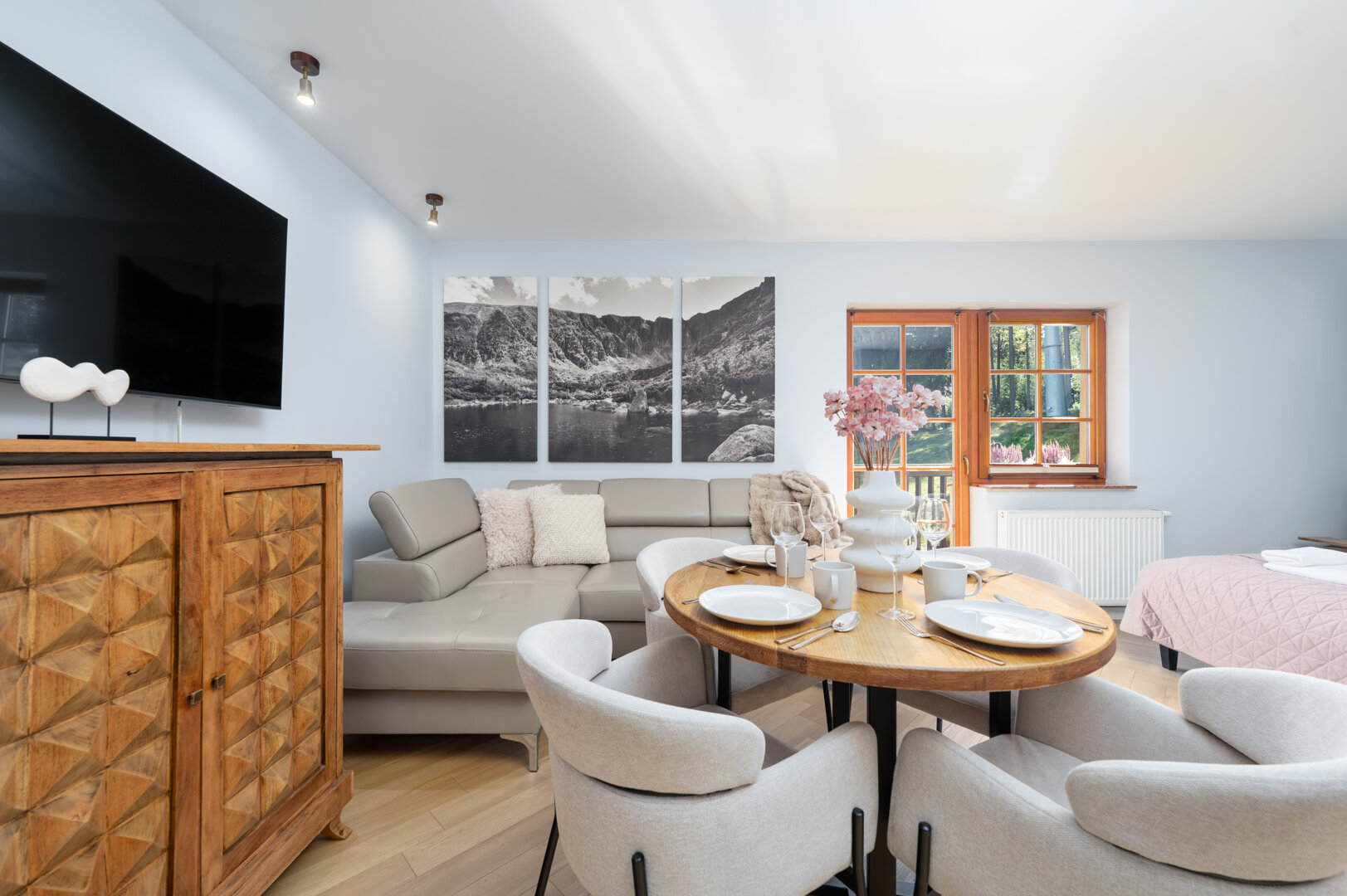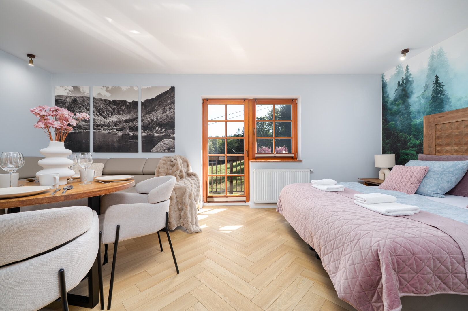 Komfortowy apartament z prywatnym jacuzzi na tarasie z widokiem na góry.