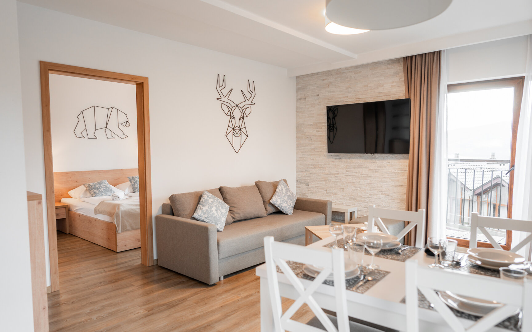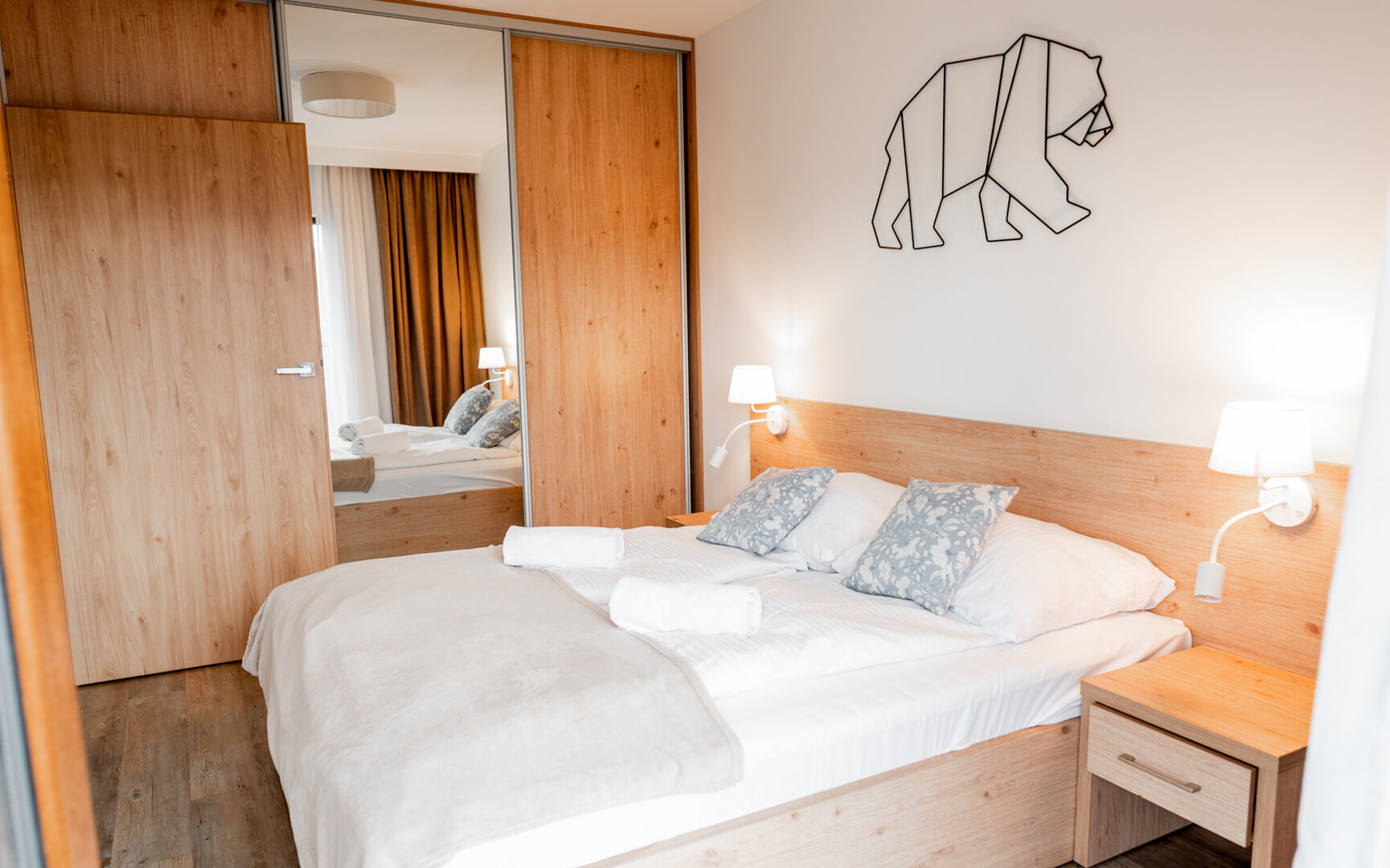 Przytulny apartament z balkonem, inspirowany naturą. Do dyspozycji gości bezpłatna sauna i pokój zabaw dla dzieci.