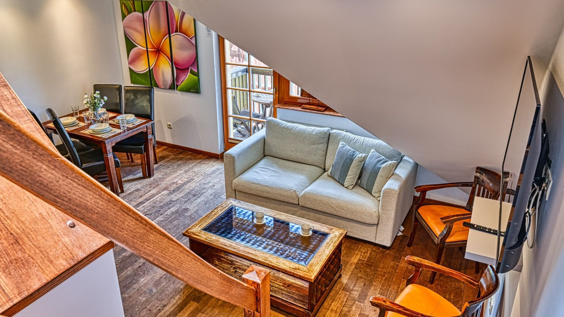 Na pierwszym poziomie apartamentu znajduje się przytulny salon z wygodną sofą i telewizorem z płaskim ekranem – idealne miejsce na relaks po dniu pełnym atrakcji.